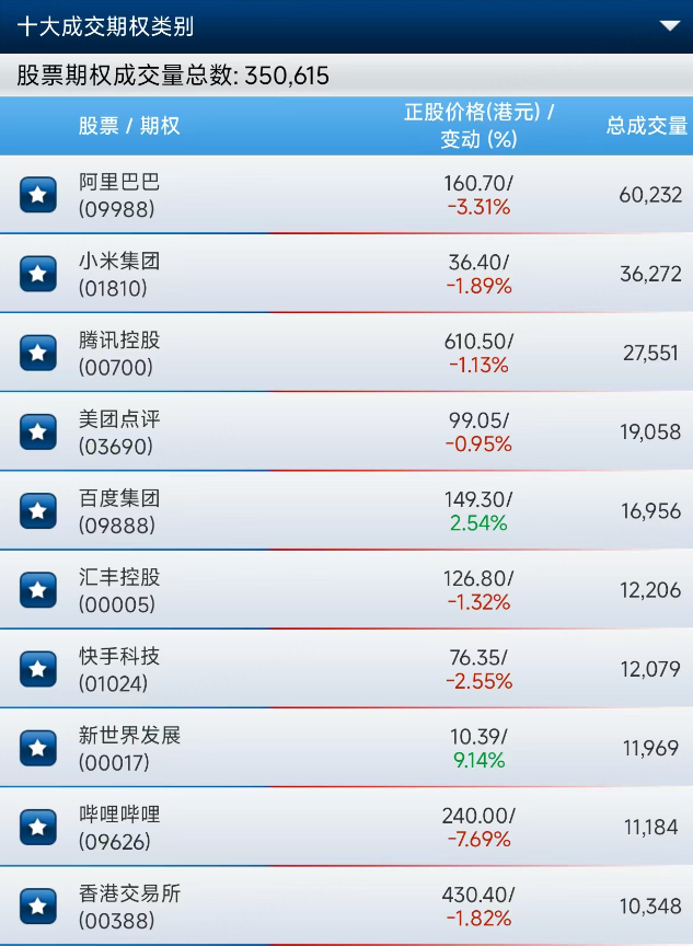 港股上午股票期權成交總量爲350615張合約。阿里巴巴期權成交量居個股首位,達60232張合約。小米、騰訊、美團、百度緊隨其後。