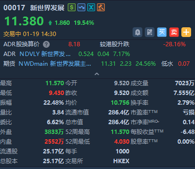 新世界系午後漲幅擴大,截至發稿,新世界發展漲近20%,成交額超7.5億港元,新世界百貨中國午後漲超24%。
