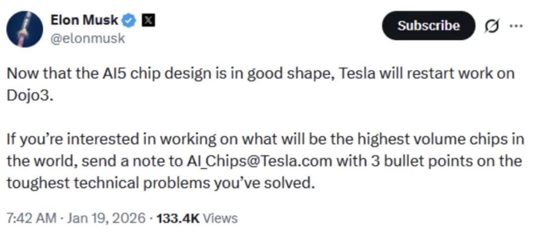 1月19日消息,馬斯克在社交平臺X上發帖稱,隨着AI5芯片設計完成,特斯拉將重啓超級計算機項目Dojo 3的開發。