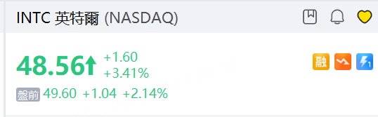 英特爾股價在盤前交易中上漲2.14%,報49.6美元。此前該股週二已上漲3.4%,年初至今累計漲幅達32%。