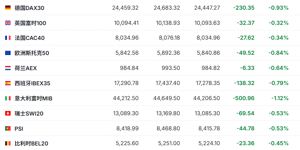 歐洲主要股指下跌,德國DAX30跌0.93%,法國CAC40跌0.34%。