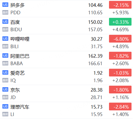 中概股盤前普漲,拼多多漲近6%,百度、嗶哩嗶哩漲超4%,阿里巴巴、愛奇藝漲超2%,京東、理想汽車漲超1%;