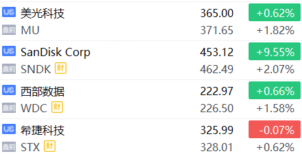 存儲概念股普漲,Sandisk漲超2%,美光科技、西部數據漲超1%,希捷科技漲近1%;