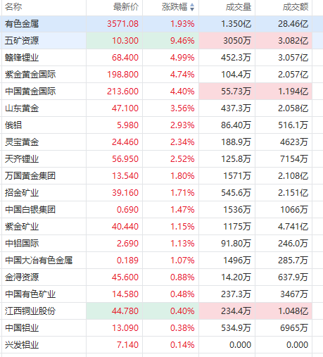 港股有色金屬股漲幅居前,五礦資源漲近9%,赤峯黃金漲超6%,紫金黃金國際、贛鋒鋰業漲近5%,山東黃金漲近4%。