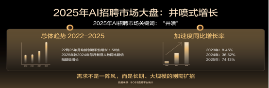 據介紹,BOSS直聘上AI相關崗位的月均新發職位數同比增速呈現出明顯的上揚曲線。2023年爲8.5%,2024年爲36.5%,2025年則達到74.1%。