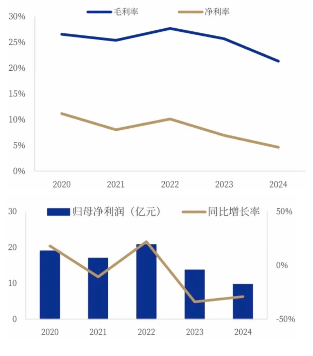 雖然2024年公司業績同比增加11%至224.57億元,歸母公司淨利潤卻出現同比29.13%,至9.71億元。而在2023年,歸母淨利潤就已經同比下滑33.89%,至13.70億元。
