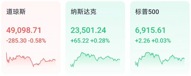週五(1月23日),美股三大指數走勢震盪。截至收盤,道指跌285.30點,跌幅爲0.58%,報49098.71點;納指漲65.22點,漲幅爲0.28%,報23501.24點;標普500指數漲2.26點,漲幅爲0.03%,報6915.61點。