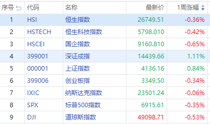 港股方面,恒生指數跌0.36%,報26749.51點;恒生科技指數跌0.42%,報5798.01點;國企指數跌0.65%,報9160.81點。