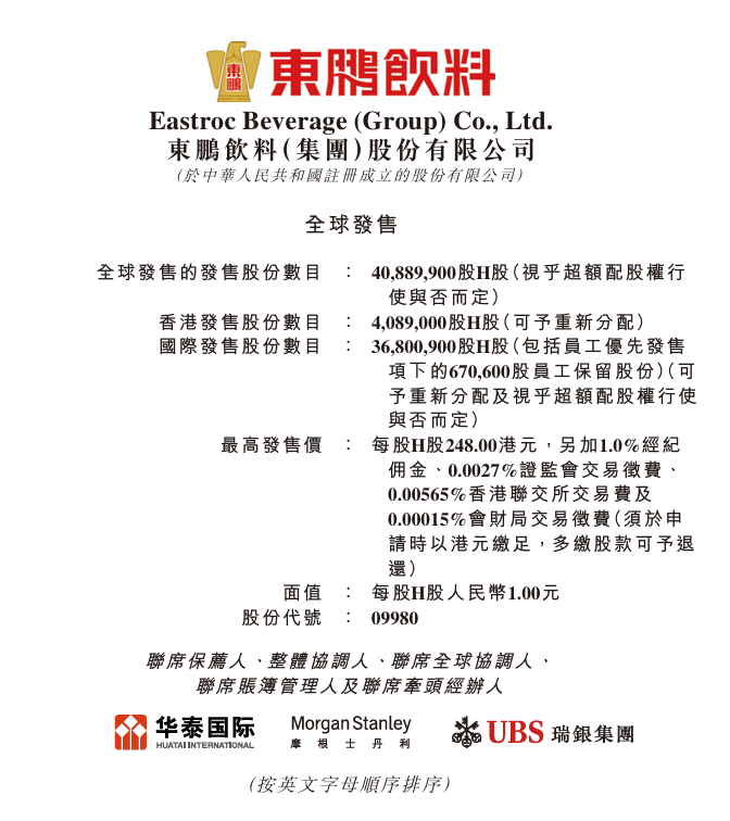 華盛資訊1月26日訊,東鵬飲料(09980)今起招股,將於2026年2月3日(星期二)上午九時正開始在聯交所買賣。其中A股市值超1300億人民幣。