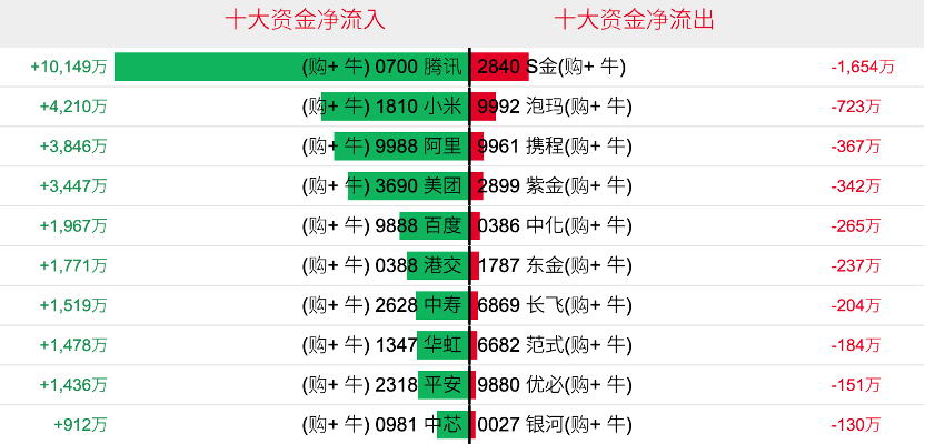 好倉(認購證及牛證)方面,過去5日,騰訊相關好倉錄得約1.01億港元資金淨流入,爲最大資金流入標的,小米集團、阿里巴巴及美團等相關好倉也分別約4210萬、3846萬以及3447萬港元資金淨流入部署;S金、泡泡瑪特以及攜程等相關好倉則分別約1654萬、723萬及367萬港元資金淨流出套現。