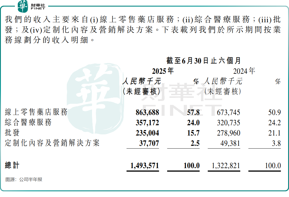 公司增長主要來自面向消費者的業務分部,具體即線上零售藥店服務與綜合醫療服務。其中,線上零售藥店服務(即「賣藥」)是其收入增長的絕對主力,2025年上半年,該業務收入同比大增28.2%,占總收入比重從上年同期的50.9%提升至57.8%,表明公司對「賣藥」業務的依賴性持續加深。