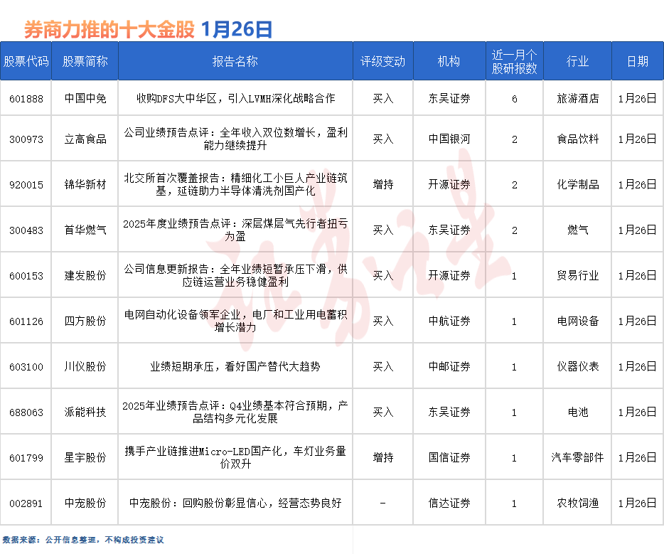 據證券之星數據庫不完全統計,1月26日券商共給予超10家A股上市公司“買入”評級。從行業分佈看,券商1月26日關注的個股聚焦於旅遊酒店、食品飲料、化學制品、燃氣、貿易、電網設備、儀器儀表、電池、汽車零部件、農牧飼漁等行業。