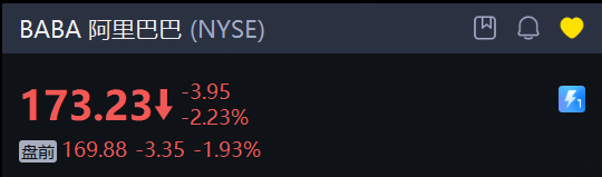 部分中概股盤前走低, 阿里巴巴 跌1.9%, 百度 跌1.45%, 嗶哩嗶哩 跌1.6%。