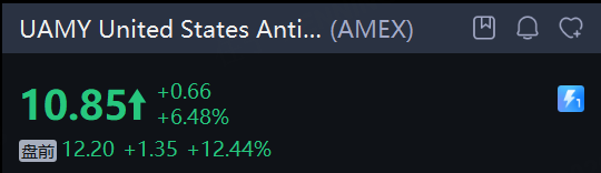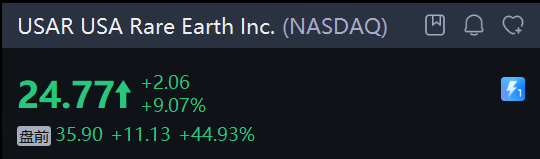 稀土公司 USA Rare Earth Inc. 盤前飆漲45%。消息稱特朗普政府計劃收購該公司10%的股份。同時, 關鍵礦產概念股盤前普漲,United States Antimony Corp 大漲12%, CRITICAL METALS CORPORATION 、 MP Materials Corp. 、 Energy Fuels Inc 漲超6%。