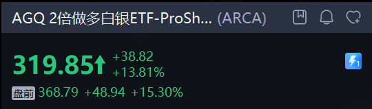 現貨白銀大漲超7%,站上110美元,現貨黃金漲超2%,均續創歷史新高。 相關概念股盤前普漲,截至發稿,2倍做多白銀ETF-ProShares 大漲超15%, 白銀ETF-iShares 漲近8%,泛美白銀漲超7%,金田、紐曼礦業、金羅斯黃金漲超4%,哈莫尼黃金漲3.92%。