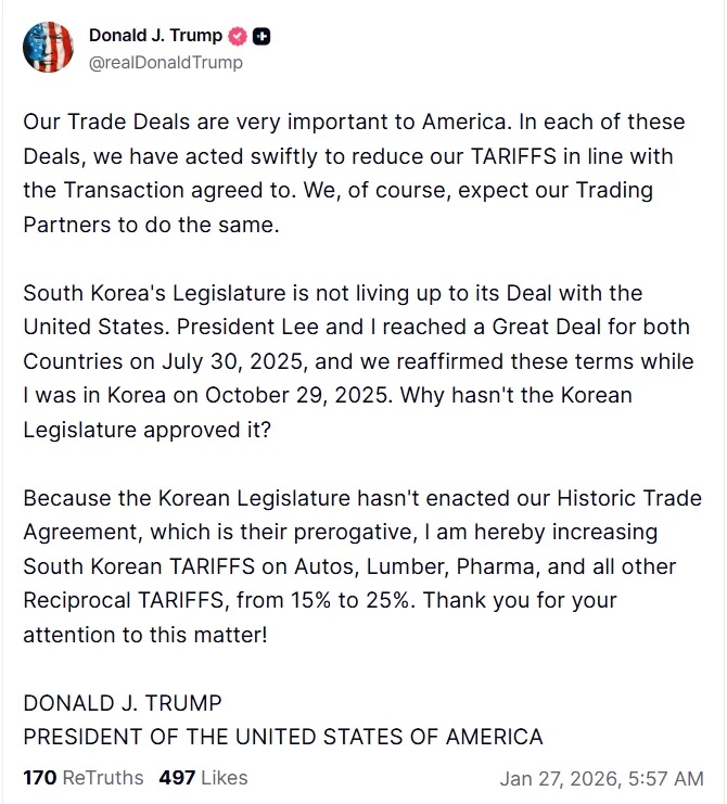 美東時間1月26日盤後時段,美國總統特朗普發文表示:韓國立法機構沒有履行其與美國達成的協議。在此宣佈將韓國的汽車、木材、藥品以及所有其他對等關稅的稅率從15%提高到25%。