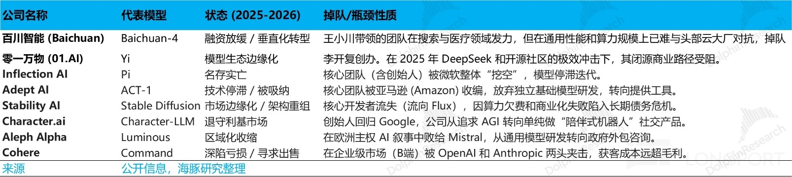 過去一年中,多數獨立創業公司,要麼在與互聯網大廠競爭中被挖走了人,要麼產品落地上創收困難,要麼是模型價格比拼中,幹不過性價比高的開源模型,模型倒在了半路上。
