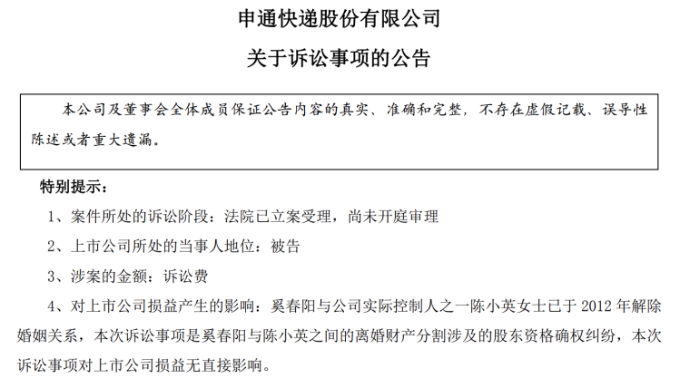 針對此次訴訟,申通快遞表示,奚春陽與陳小英已於2012年解除婚姻關係,本次訴訟事項是奚春陽與陳小英之間的離婚財產分割涉及的股東資格確權糾紛,本次訴訟事項對公司損益無直接影響。