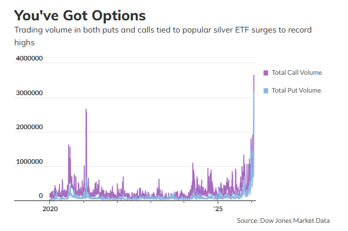 FactSet 數據顯示,自2025年1月1日以來,白銀期貨在連續合約口徑下累計上漲了230%。與此同時,熱門白銀ETF以及與這些ETF掛鉤的期權合約,其交易量在週一飆升至歷史最高水平。