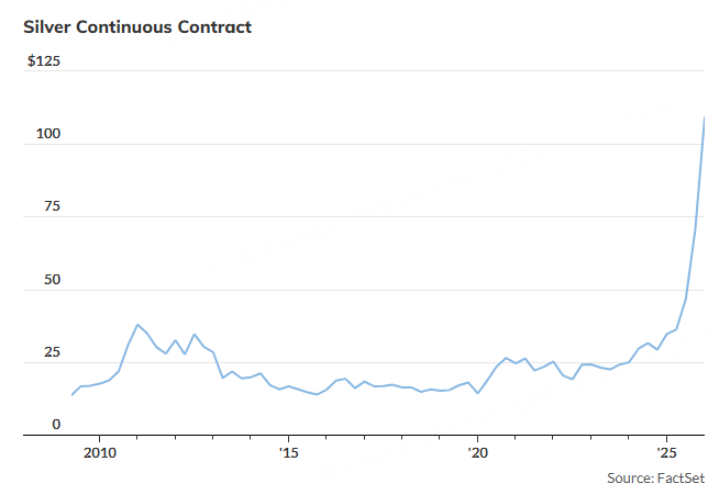 白銀期貨週一大漲14%,創下自1985年3月19日以來的最佳單日表現;自2025年1月1日以來累計漲幅已達230%。