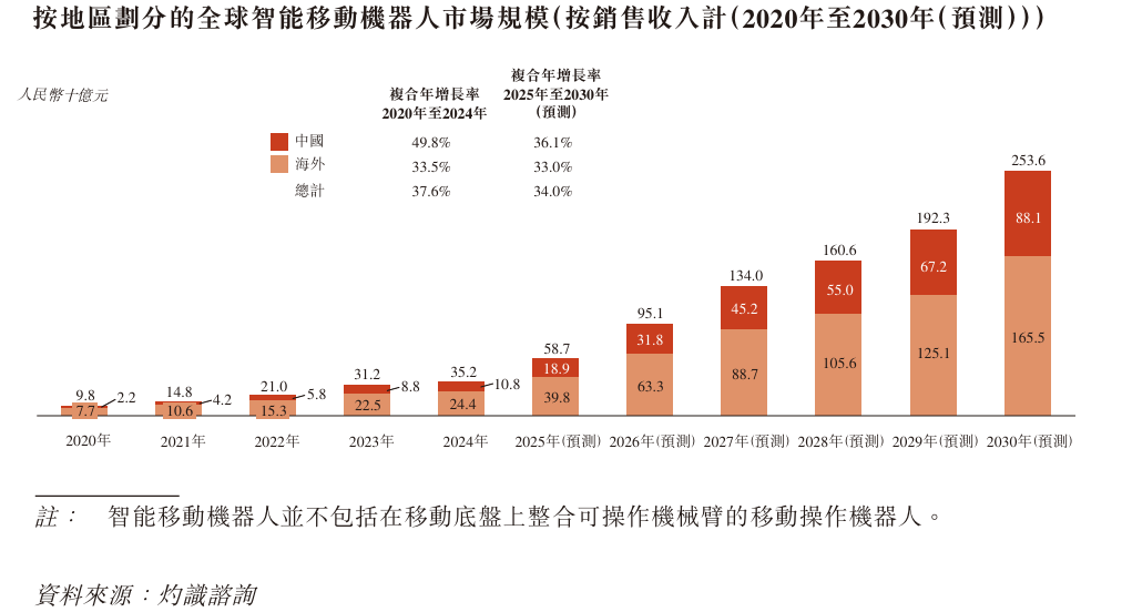 按銷售收入計,全球智能移動機器人市場規模由2020年的98億元增至2024年的352億元,複合年增長率爲37.6%,預期到2030年將達2,536億元,2025年至2030年的複合年增長率爲34.0%。在中國,智能移動機器人市場規模由2020年的22億元增至2024年的108億元,複合年增長率爲49.8%,預期到2030年將達881億元,2025年至2030年的複合年增長率爲36.1%。