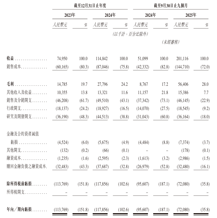 公司於2023、2024年分別錄得收入7495萬元、1.15億元。2025年首9月,收入同比增長2.94倍至2.01億元。