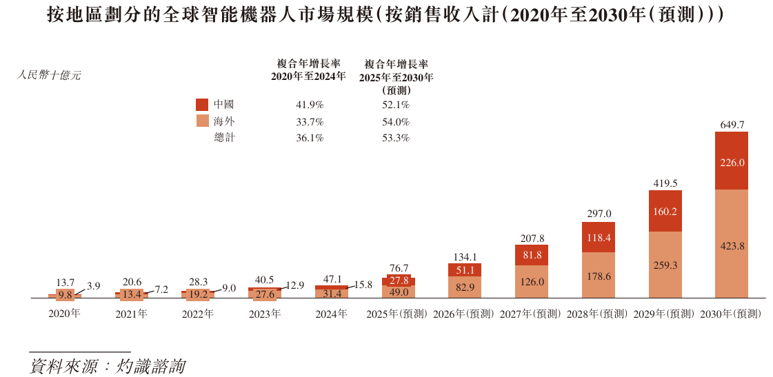 全球智能機器人產業已進入高速增長時期。按銷售收入計,全球智能機器人的市場規模由2020年的137億元增至2024年的471億元,2020年至2024年的複合年增長率爲36.1%,並預計於2030年達到6,497億元,2025年至2030年的複合年增長率爲53.3%。
