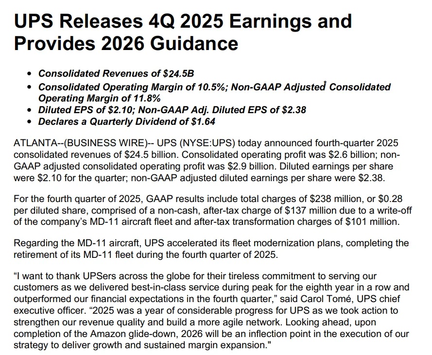 聯合包裹第四季度營收245億美元,調整後每股收益爲2.38美元,均超市場預期。