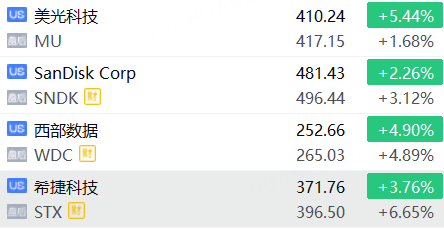 受此消息影響,希捷科技盤後漲超6%。同時帶動存儲概念股走高,西部數據漲近5%,SanDisk漲超3%,美光科技漲近2%。