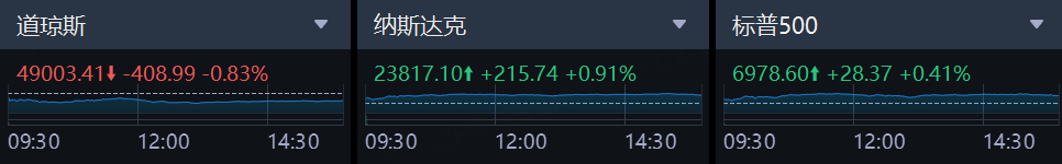 週二,美股三大指數漲跌不一。受科技股和芯片股提振,標普500指數收於新高;聯合健康股價大跌,拖累道指收低。截至收盤,標普500指數漲0.41%,報6978.60點,刷新了1月12日創下的收盤紀錄;納斯達克綜合指數漲0.91%,報23817.10點;道瓊斯指數跌0.83%,報49003.41點。