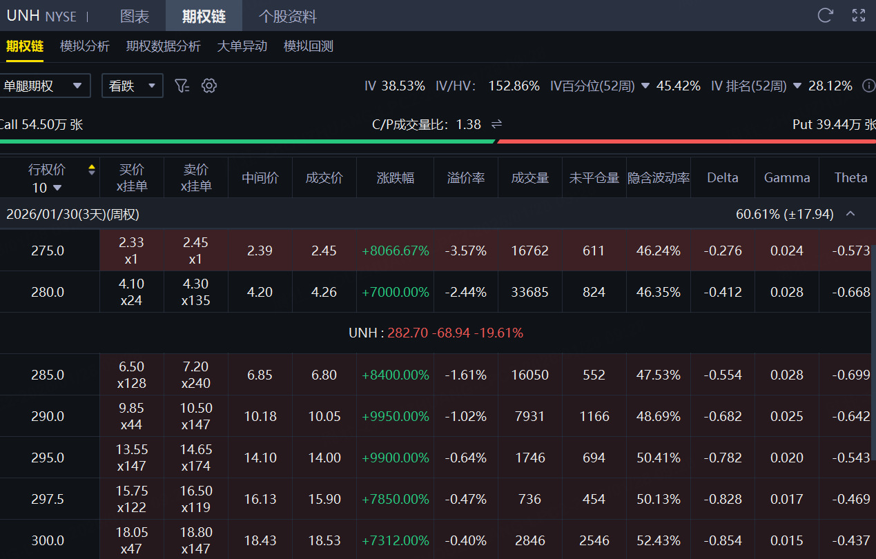 期權方面,聯合健康當日成交93.94萬張,較90日均量放大逾6倍,看漲期權佔比58%,其中於1月30日到期的280美元行使價的看跌期權成交居前,成交逾3萬張;此外,從期權鏈上看,聯合健康多張Put單翻倍大漲,最高飆漲9950%。