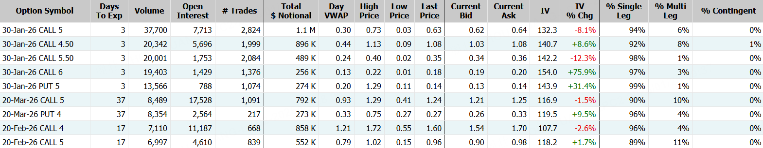 期權方面,Richtech Robotics當日成交28.26萬張,較90日均量放大逾5倍,看漲期權佔比79.3%,其中於1月30日到期的5美元行使價的看漲期權成交居前,成交逾近3.8萬張。