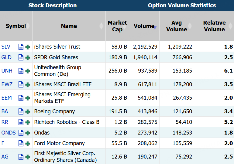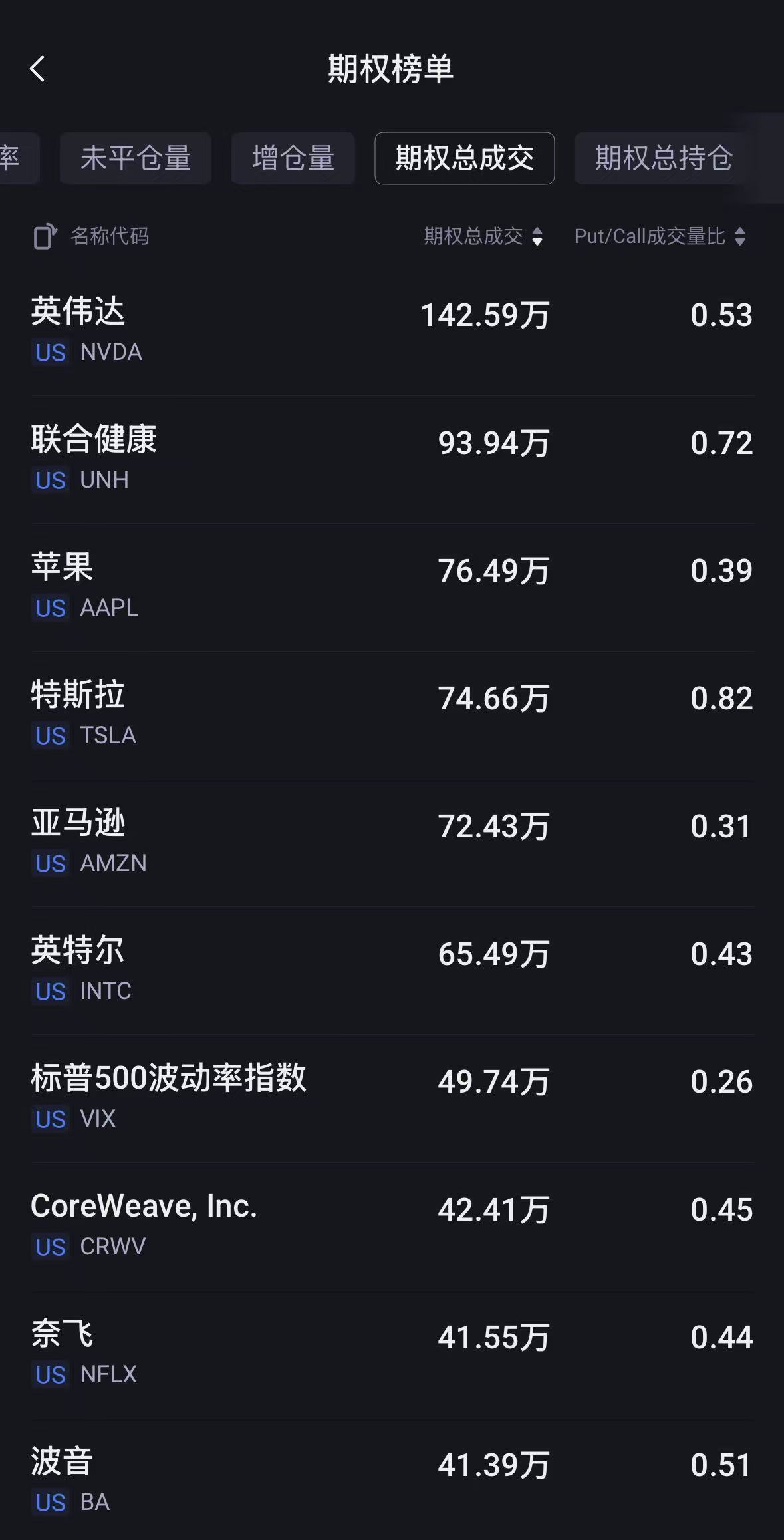 期權市場總成交量5146.97萬張合約,低於90日均量;聯合健康當日成交93.94萬張,多張Put單翻倍大漲,最高飆漲9950%;Richtech Robotics當日成交28.26萬張,看漲期權佔比攀升至近80%>>