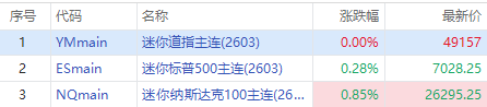 美股三大期指週三盤前集體走高,納指期貨 $NQmain 漲0.85%,標普500期貨 $ESmain 漲0.28%,道指期貨 $YMmain 平盤。