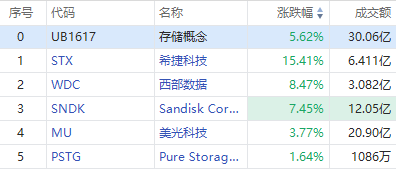 希捷科技績後暴漲14%,存儲概念集體走高,美光科技漲超4%,SanDisk $SNDK 漲超6%,西部數據漲超8%。