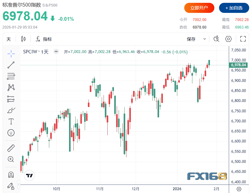 FX168財經報社(北美)訊 標普500指數週三(1月28日)觸及一項里程碑水平,盤中首次站上7000點,但隨後由於美聯儲維持利率不變而回落。
