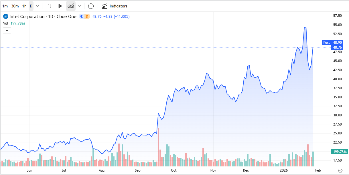 在ASML訂單強勁、行業景氣預期走高帶動芯片股普漲的背景下,英特爾(Intel)成爲當日漲幅最突出的個股之一,股價週三大漲約11%。市場催化劑來自一則報道稱,英偉達與蘋果計劃將2028年部分芯片產能轉向英特爾代工,同時仍保留與臺積電的合作關係。若上述合作落地,將被視爲英特爾代工業務爭取頭部客戶的重要突破,有望明顯提升市場對其製造能力與客戶拓展進展的信心。報道還提到,美國本土製造導向、關稅壓力等因素可能對英特爾更有利;部分華爾街觀點亦認爲,與英特爾合作可能在政治層面具備「加分效應」。與此同時,臺積電股價當日小幅上漲、英偉達走高、蘋果微跌;英特爾年內累計漲幅已接近三成,顯示資金對其「代工轉型敘事」正在重新定價。