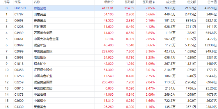 華盛資訊1月29日訊,港股有色金屬概念股漲勢不歇!山東黃金、赤峯黃金漲超5%,五礦資源漲超4%,紫金礦業、中國黃金國際、洛陽鉬業、招金礦業、江西銅業股份均漲超3%,紫金黃金國際漲超2%,中國鋁業漲超1%。