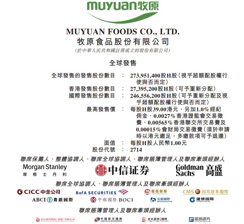 1月29日,牧原股份發佈公告,於1月29日至2月3日招股,公司擬全球發售2.74億股,每股發售價不超過39港元,每手100股,入場費3939.34港元,摩根士丹利、中信證券及高盛爲聯席保薦人,預計將於2月6日開始在港交所掛牌交易。