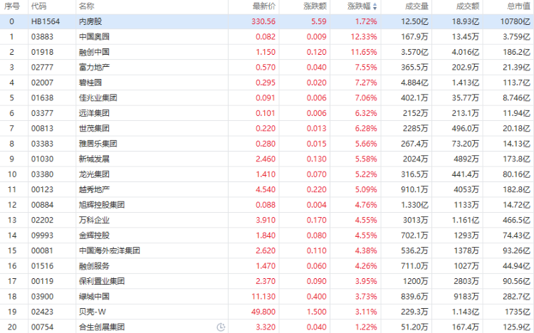 華盛資訊1月29日訊,港股內房股集體上攻!融創中國漲超11%,碧桂園漲超7%,新城發展、越秀地產漲超5%,萬科企業漲超4%,綠城中國、貝殼-W漲超3%。