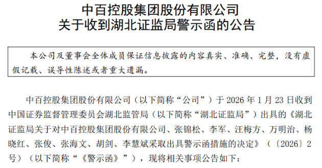 受前述職務侵佔案影響,中百集團在2024年對2016年至2022年及2023年前三季度的財務報表數據進行了追溯更正。此後在2025年4月,公司又對2016年至2023年度的相關財務數據進行了再一次更正。基於此,湖北證監局在近期下發的《警示函》中指出,公司2016年至2023年期間的財務數據披露不真實,違反了信息披露的相關規定。
