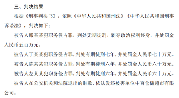 兩年多後,該案終於迎來一審判決。根據中百集團1月23日發佈的公告,判決結果顯示,邵某某犯職務侵佔罪,判處無期徒刑,剝奪政治權利終身,並處罰金五百萬元,其餘三名被告人被判處有期徒刑並處罰數萬元不等。