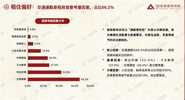 對於租房人羣而言,居住的邏輯對比購房人羣有明顯差異。58同城、安居客調研數據顯示,66.2% 的租房人羣將交通通勤列爲首要考慮因素,顯著高於周邊環境、子女教育或小區硬件設施等條件。
