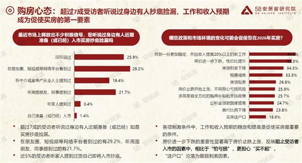 在入市的條件上,購房者的判斷更爲審慎。“工作與收入提升”“房價進一步下行”“房貸利率下降”被認爲是影響 2026 年購房決策的三項關鍵因素。其中,選擇“房價進一步下行”的比例爲 42.3%,顯著高於選擇“房價止跌回升”的 25.9%,也反映出購房者在決策中,相較於“擔心虧損”,更在意“是否還能負擔得起”。
