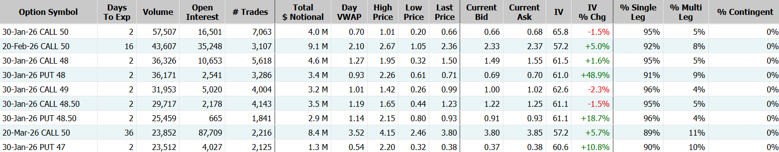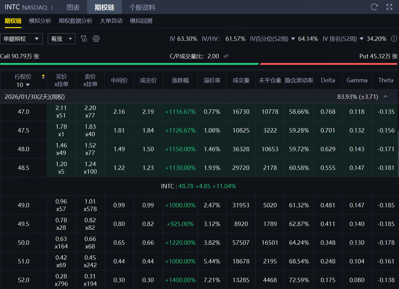 期權方面,英特爾當日成交136.11萬張,環比前一交易日翻倍,看漲期權佔比66.7%,其中於1月30日到期的50美元行使價的看漲期權成交居前,成交逾5.7萬張;此外,從期權鏈上看,英特爾多張於1月30日到期的Call單漲超1000%。