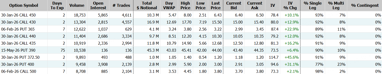 期權方面,美光科技當日成交56.88萬張,較90日均量放大近2倍,看漲期權佔比54.3%,其中於1月30日到期的450美元行使價的看漲期權成交居前,成交逾1.8萬張。