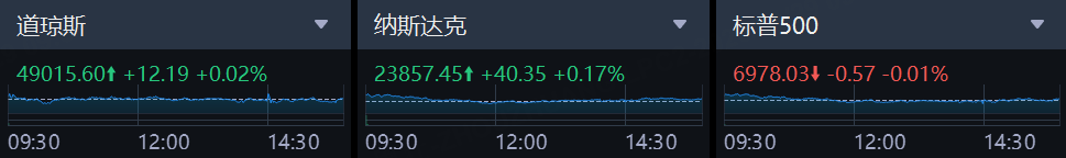 週三,美股三大指數漲跌不一,截至收盤,道瓊斯指數漲0.02%,報49015.60點;納斯達克綜合指數漲0.17%,報23857.45點;標普500指數跌0.01%,報6978.03點,早盤一度升破7000點大關,最高報7002.28點,創下盤中紀錄。
