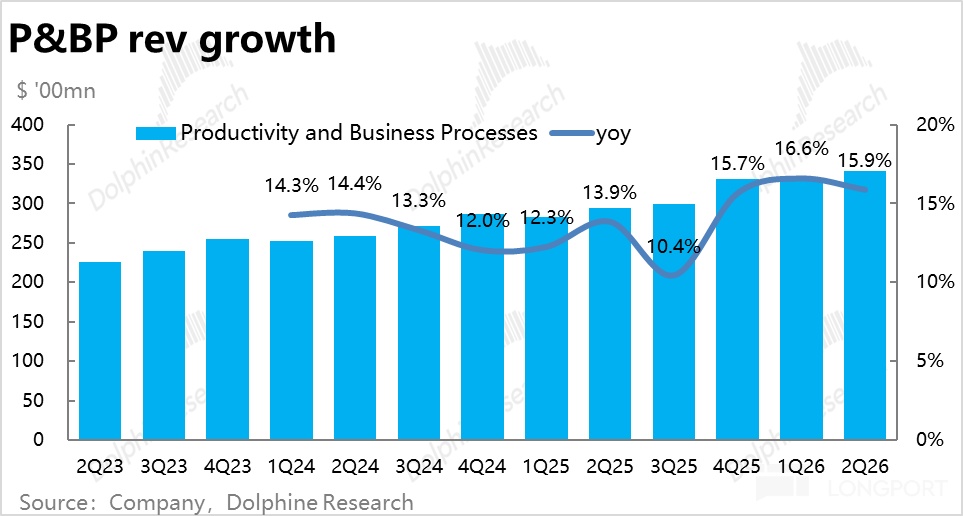 整體上,在覈心商用 M365 業務增長平穩,其他各板塊加速或放緩幅度也都不大的情況下,本季生產力流程板塊的整體的營收$341 億、增速爲 15.9%,較上季只是略有降速,依然小超賣方一致預期和公司此前指引($333~336 億)。