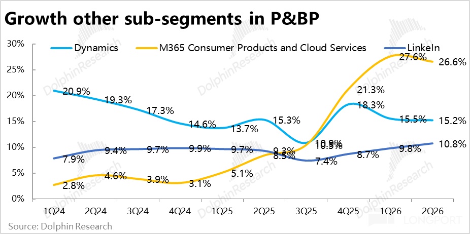 生產力板塊中的其他業務中,可見 Dynamics 的增長大體平穩,維持在 15% 左右的增速;LinkedIn 的增長在低迷了相當時間後,有初步的回暖跡象,不變匯率下增速由 8% 緩慢修復到本季的 11%。
