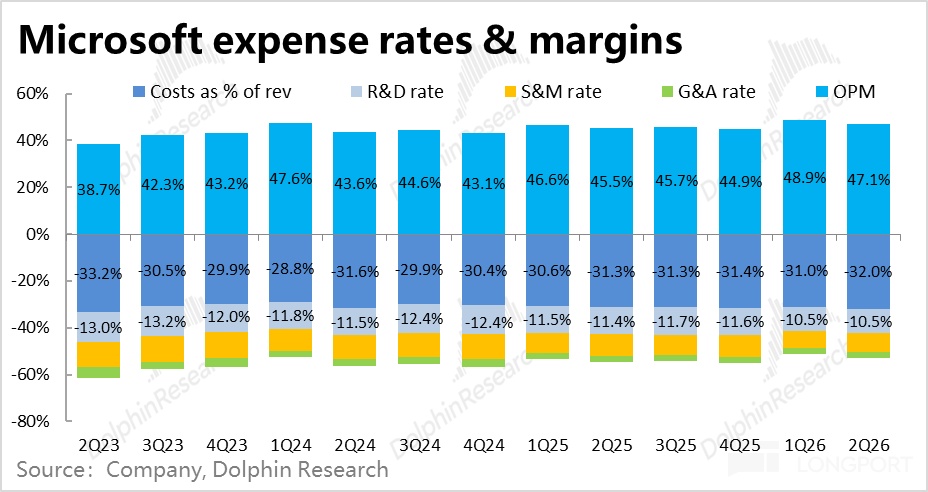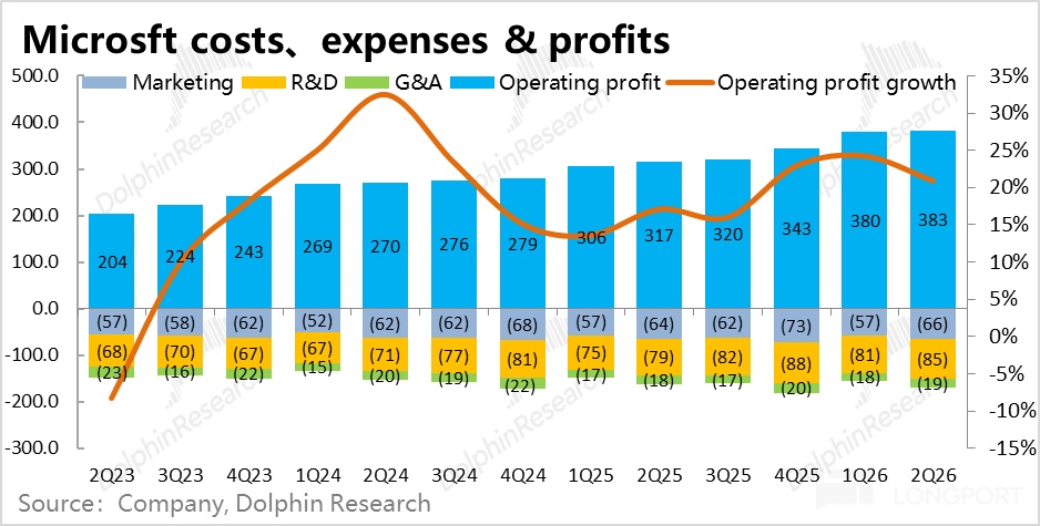 b. 費用角度,微軟本季的營銷、研發和管理費用三費合計同比增長僅 5.4%,遠低於營收和毛利潤都在 15% 以上的增速。因此雖然真實收入增速在放緩,毛利率也承壓下降,但在良好的控費下,經營利潤率仍同比走高了 1.6pct。